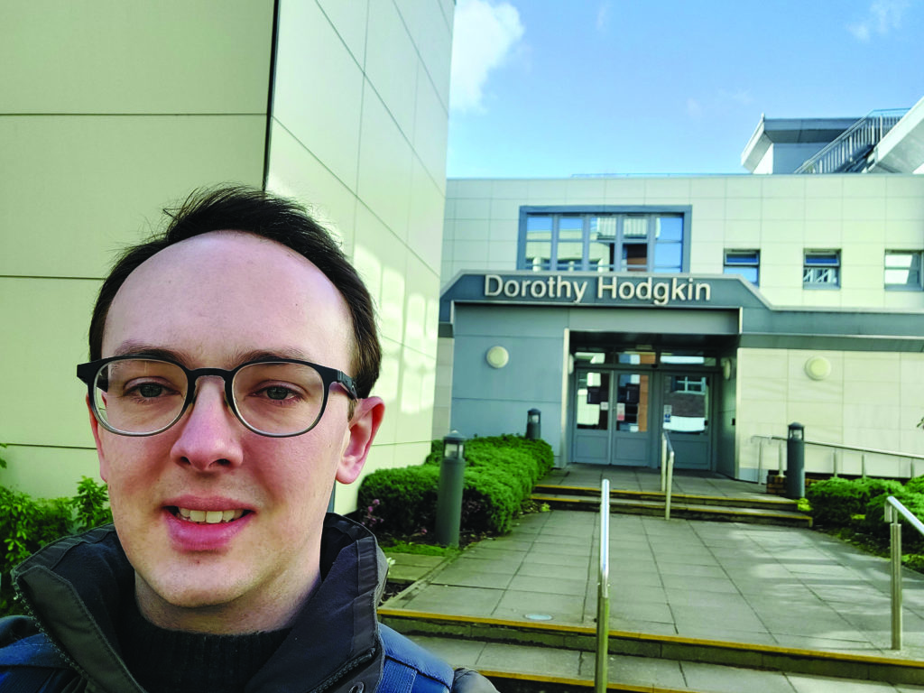上图:克里斯·斯特里特站在英国基尔大学心理学院的多萝西·霍奇金大楼外。