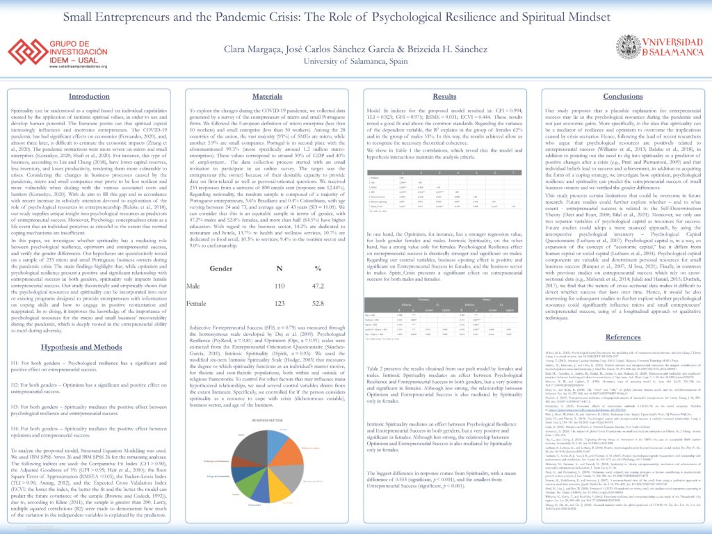 这项研究(现在发表在心理学前沿)强调了心理资源(如韧性)和小微企业家的精神心态在应对新冠肺炎大流行中的重要性。我们的研究表明,创业成功的一个合理解释可能在于大流行期间的心理资源,而不仅仅是经济收益——更具体地说,精神可以成为克服危机情景造成的影响的弹性和乐观情绪的中介。此外,本研究还揭示,对于女性企业家来说,精神在心理弹性与创业活动成功之间具有很强的正向中介作用。