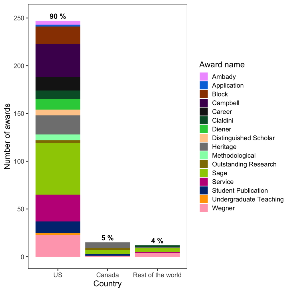 美国的主导地位不仅体现在出版物和编辑委员会的职位上。这本杂志的出版商APS主要将奖项颁发给来自北美(金宝搏官网登录炸,2018).人格与社会心理学学会颁发的最负盛名的奖项授予了来自美国的学者(见图60页)。心理科学加速器是一个国际研究网络,只有35%的成员来自美国、加拿大和欧洲以外的国家。Paris et al., 2020),尽管这些世界地区包括占世界人口的86%尽管文化多样性是该电视网的一大特点188金宝搏官网app注册指导原则.在积极致力于提高成员地域多样性的心理科学促进协会(Society for the Improvement of Psychological Science)中,53%的成员来自美国(44%)和加拿大(9%);188金宝搏官网app注册Hilgard 2020).该组织不到1%的成员来自南亚、拉丁美洲、加勒比、北非、中东和撒哈拉以南非洲地区。
