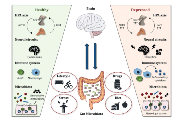 thomas Bastiaanssen及其同事在2020年的一篇综述中进一步研究了微生物组在抑郁症中的作用,探讨了肠道微生物组与重度抑郁症之间的相互作用。他们写道:“肠道微生物群是一个高度动态的系统,随着时间的推移不断发生变化。”“变化的程度和方式被认为是由多种因素共同决定的,从生活阶段到锻炼。”他们引用了有关地中海饮食的研究,地中海饮食通过增加具有抗炎特性的细菌的丰度来影响肠道微生物群,还被发现可以缩短抑郁症的发作时间。