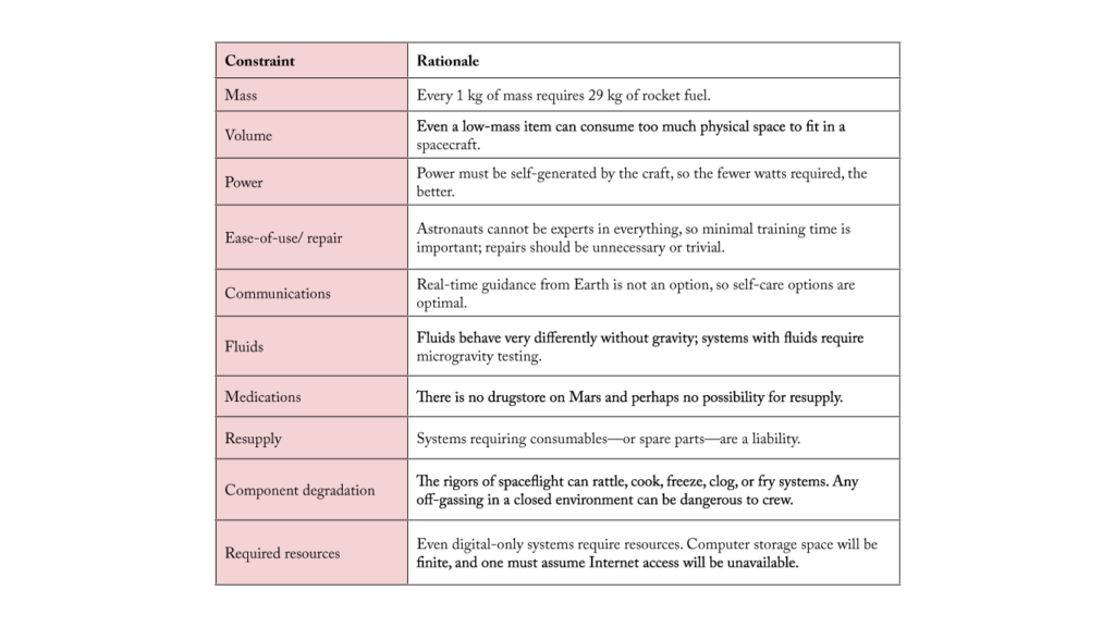 的资源来应对这一挑战,美国宇航局计划没有一个心理学家或精神病学家火星船员。因此,所有支持的行为健康需要带来了一些其他形式。因为从地球提升商品的难度,“火星包装”成为一个挑战。表2提供了许多重要的注意事项,适用于采取探索太空飞行器上搭载的物品。大部分的局限性与向空间发射项目的困难(需要最小的质量和体积),地处偏远的探索航班(有限的通信和补给),和独特的环境(体液,退化)。而火星任务设计方案仍在发展,探索医药箱可以小至两个鞋盒。空间必须包含一切医疗:从药物绷带,医疗设备一次性用品。不管鞋子的尺码,这并不是很大的空间,因此组件的医药箱,可以帮助多个医疗条件或用于各种设置高度青睐。