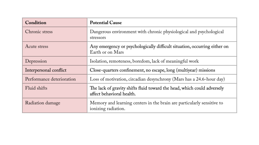 6个月的凌日,来自火星可能会代表最限制旅行的一部分,因此最大的风险,但预期的18个月保持表面上(因为轨道力学和地球和火星之间的不同距离)带来了令人生畏的行为健康挑战。