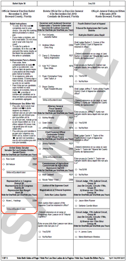 这个例子来自共和党人里克·斯科特和民主党人比尔·尼尔森之间的美国参议院竞选。斯科特在全州范围内的领先优势(经过多次重新计票)为10033票(约占820万张选票的0.1%)。布劳沃德县是一个强烈支持民主党的县;纳尔逊以69%对31%获胜。然而,在这场竞选中,近3.1万名选民没有投票。为什么?请参阅下面布劳沃德县的选票,其中突出显示了经常错过的比赛。
