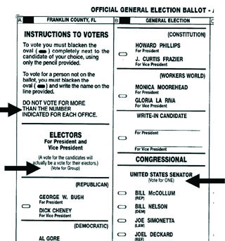 也许这次投票只是需要更好的指示,以帮助选民知道会发生什么,并决定该怎么做(尽管即使这样也可能无法克服糟糕的设计)。可悲的是,通常是写得不好的说明导致选民会犯错误。2000年佛罗里达州富兰克林县的总统选举就是一个很好的例子。在下面这张选票中,总统竞选要求选民“为团体投票”,而国会竞选要求选民“为一人投票”。对这些标签的混淆导致超过10万选民过度投票,这意味着他们投票给不止一组总统候选人(基廷,2001)。几乎可以肯定的是,总统竞选分散在两个栏目,促使一些选民在两个栏目都投了票,这加剧了这个问题。不管根本原因是什么,这种过度投票意味着他们的选票根本没有被计算在内。