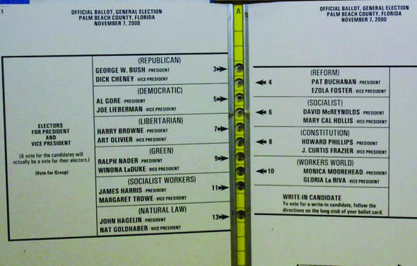 讽刺的是,这张选票的布局是为了协助选民,不要混淆他们。通常,根据佛罗里达州的选举法,所有候选人的名字都应该列在选票的左侧。然而,县里的职员担心候选人太多会缩小字体——这对老年选民来说是一个特别的问题——选择使用更大的字体,这就需要使用选票的两面。