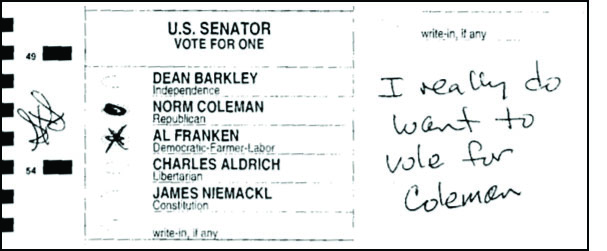 现在考虑通过邮件投票。没有明显的纠正程序;事实上,各司法管辖区在如何处理纠正方面有所不同。根据各州的不同,如果有时间的话,选民可能需要申请一张新的选票。有些州允许纠正,但他们必须遵守一定的规则。下图显示的缺席选票来自2008年明尼苏达州参议员诺姆·科尔曼和阿尔·弗兰肯之间的竞选。两党都将这张选票标记为进一步审查,科尔曼阵营声称选民的意图很明确(尽管弗兰肯也被选中了),弗兰肯阵营声称选票无效,因为选民用自己的首字母表明了自己的身份(这是明尼苏达州投票规则所禁止的)。随着邮寄选票数量的增加,这类标记错误将变得更加普遍,选民需要指导他们在犯错误时如何做。