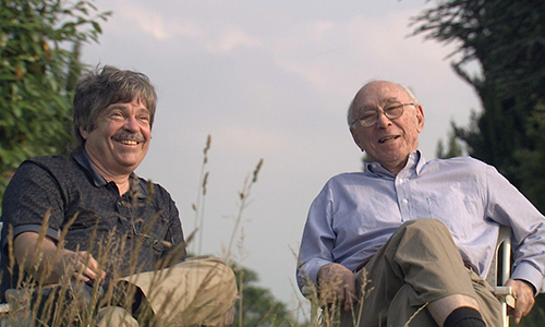 Alan Kay和杰罗姆·布鲁纳交谈在山上Reggio Emilia之上,2002。他们正在拍摄“小猪”,一个获奖的电视电影和DVD。