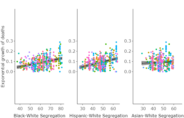 许多美国城市高度隔离的一直认可(Massey &丹顿,1989)。但是,种族隔离的城市流感大流行期间遭受更多吗?我们最近研究这个问题通过使用日常项县级COVID-related死亡(Yu et al ., 2020)。我们看美国100个最大城市地区,种族隔离的不同程度。可以描述之间的隔离程度两组通过计算每组的人口比例从之前必须将两组的分布与随机的。如果这个比例上升,大都会区域问题是更多的种族隔离。例如,芝加哥是相当高的黑人和白人之间的隔离;事实上,超过70%的居民将被迫迁移,消除种族隔离。