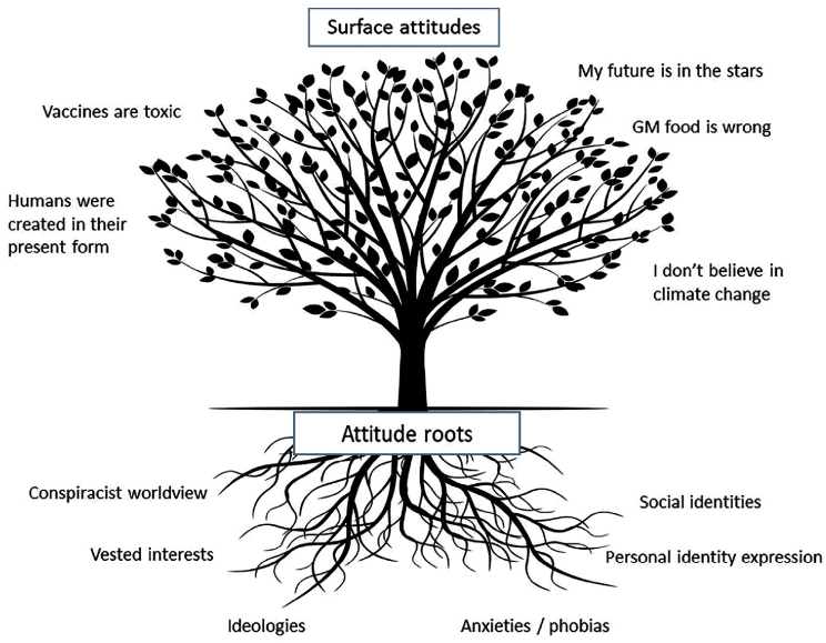 马修·霍恩西(Matthew Hornsey)提供了一种解决科学否认的方法,它超越了向人们强行灌输科学事实。尽管受教育程度和科学素养都很高,但人们往往会坚持自己的错误信念(Drummond & Fischoff, 2017)。Hornsey认为,更有用的方法是考虑导致人们错误信念的否定科学的根源。霍恩西用一个树状比喻,指出了否认科学的六个根源,在态度的持久改变成为可能之前,这些根源必须得到解决:阴谋论的世界观;既得利益者,意识形态,焦虑和恐惧,个人同一性表达,社会身份。