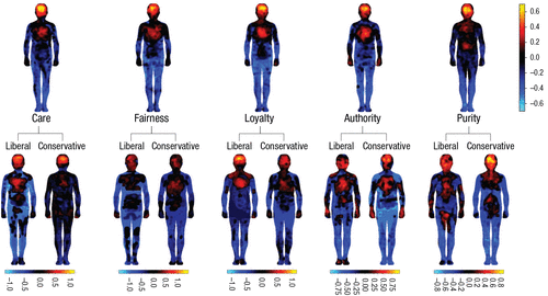 雅达利及其同事写道:“对于所有的道德问题,我们可以根据身体感觉地图对政治意识形态进行分类,这表明自由主义者和保守主义者在身体的不同部位感到道德违反,尤其是对忠诚和纯洁的感觉。”